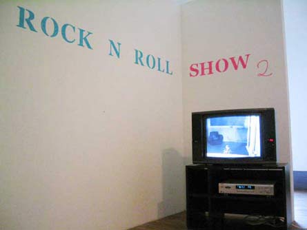 L’inscription Rock N Roll Show écrite en bleu et rose sur un des murs de l’endroit